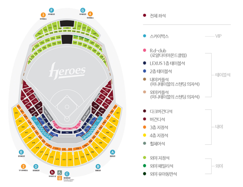- 내야 중앙 블록 : 스트라이크존 정면에서 보는 시야 확보 → 투수와 타자의 대결을 가장 몰입감 있게 즐길 수 있음