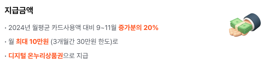 - 환급 기준: 2024년 월평균 카드 소비보다 증가한 금액의 20% 환급